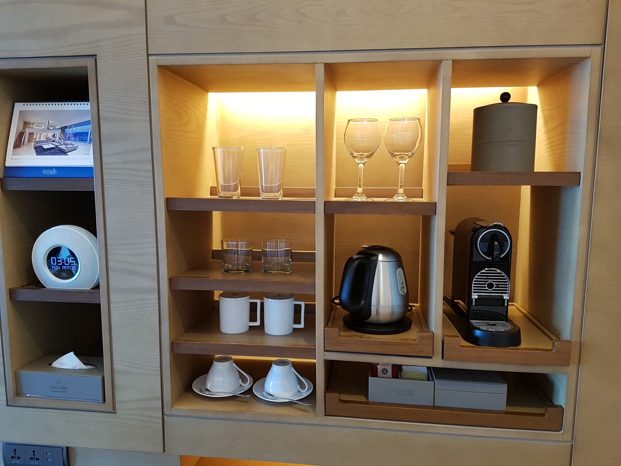 탁상용 달력, 시계, 크리넥스 화장지, 와인잔, 머그컵, 유리컵, 커피잔, 커피포트, 커피 내려먹는 기계, 오설록 차, 믹스커피 등등이 마련돼 있어요.