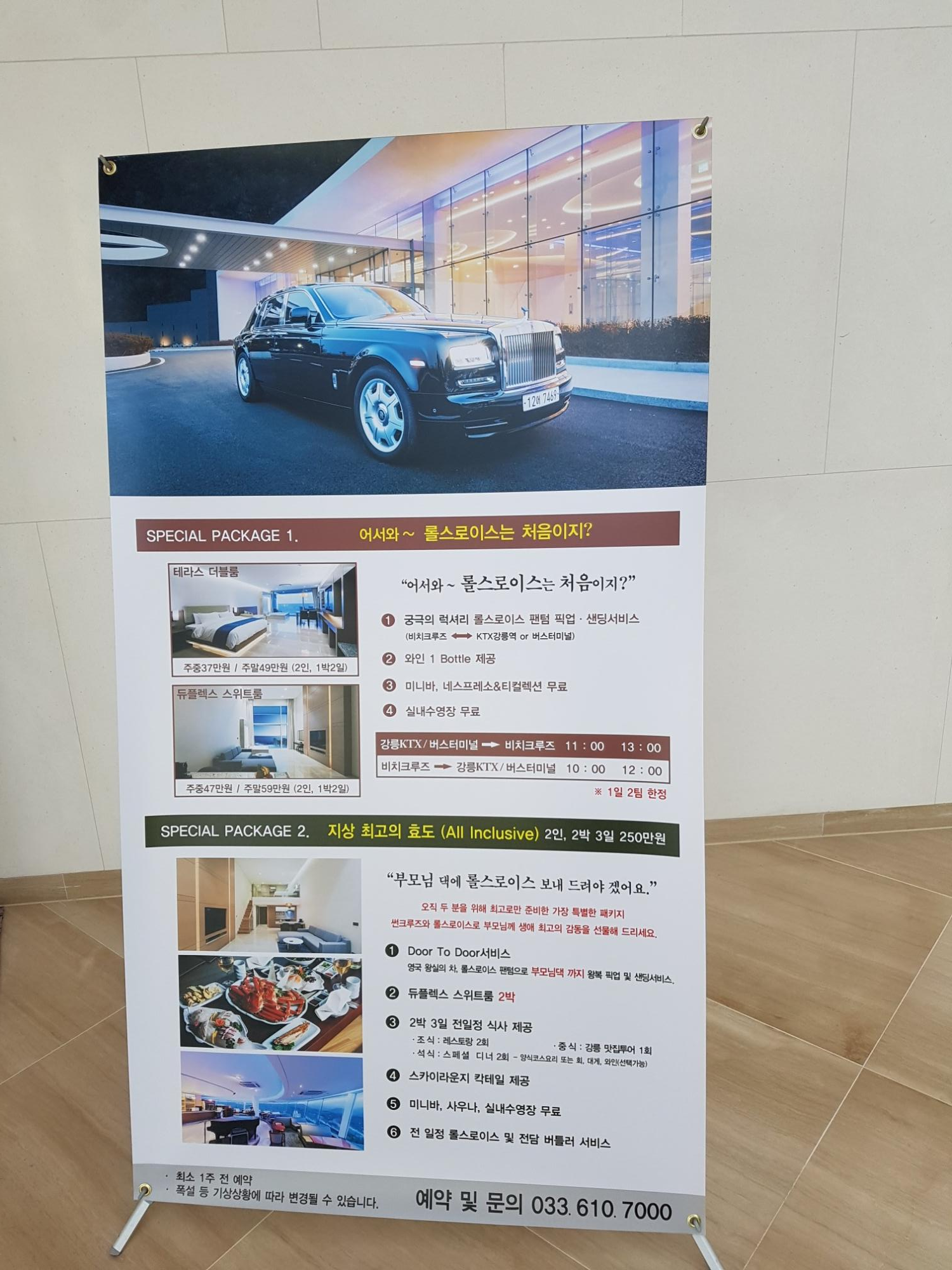 비치크루즈는 위의 사진에 보시는 것처럼 스페셜 패키지를 운영하고 있는데요. 테라스 더블룸과 듀플렉스 스위트룸 예약자에 한하여 '어서와 롤스로이스는 처음이지', 지상 최고의 효도(all inclusive) 2박에 250만원의 패키지를 선보이고 있네요.