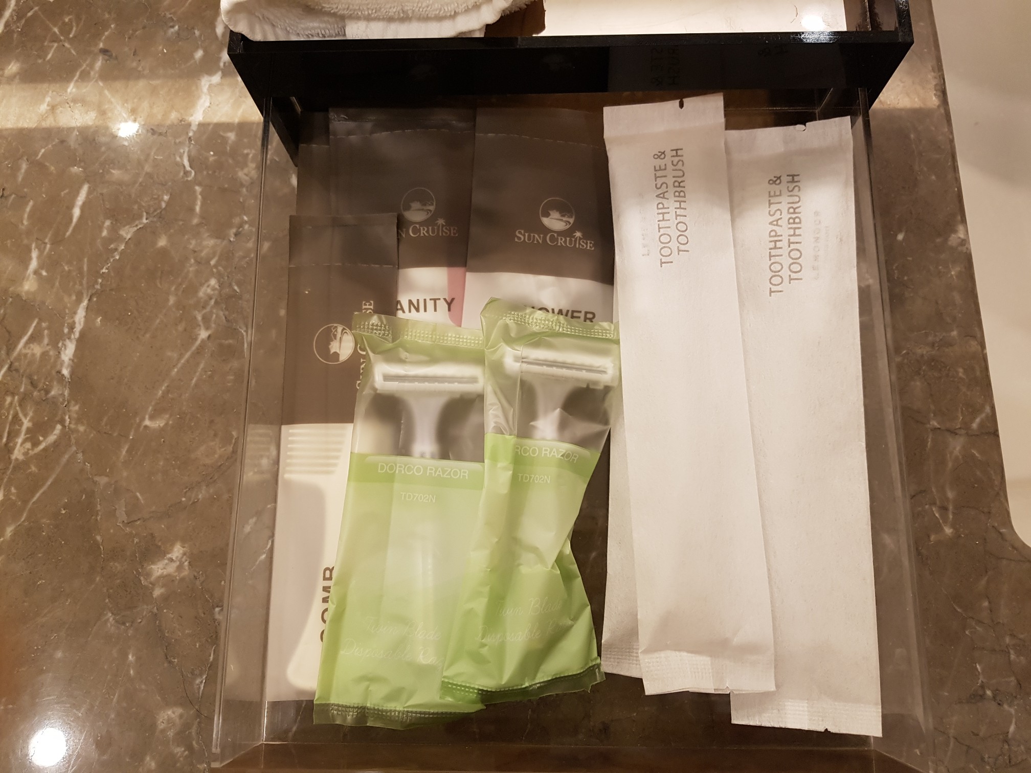 썬크루즈 어메니티에는 빗, 면도기, 칫솔, 치약, 바늘과 실, 비누, 바디워시, 샴푸, 린스 등이 마련돼 있습니다.
