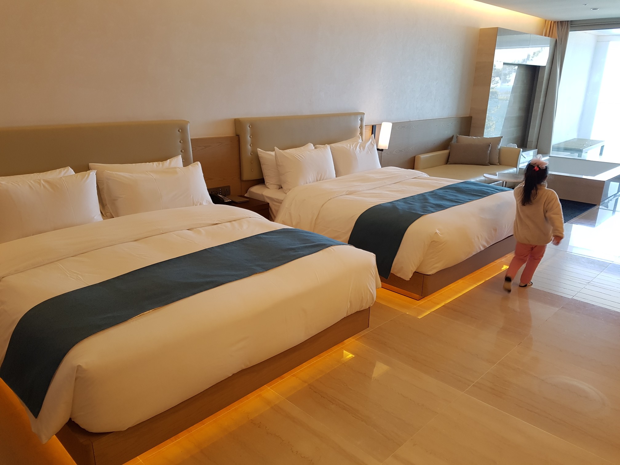 킹사이즈 두개의 침대가 있고요. 기준은 4인인데 최대 5인까지 가능한 방이랍니다.
