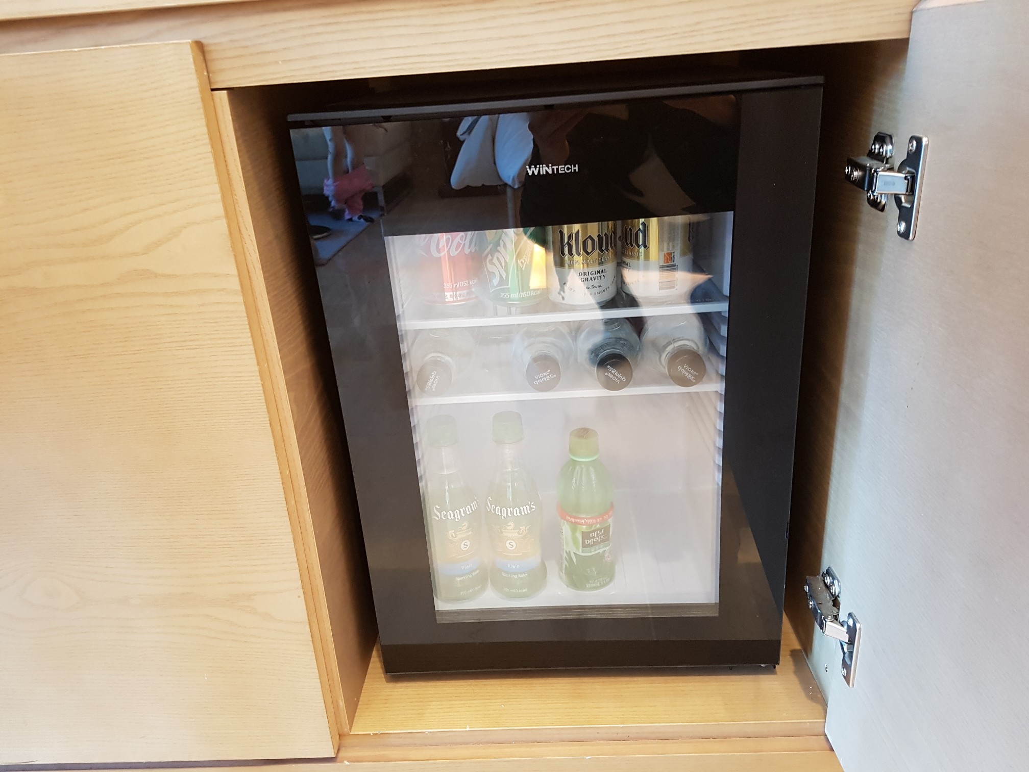 미니바에는 코카콜라, 스프라이트 캔, 클라우드 맥주 2캔, 생수 4병, 씨그램 탄산수 2병, 미닛메이드 알로에 1병이 들어 있어요.