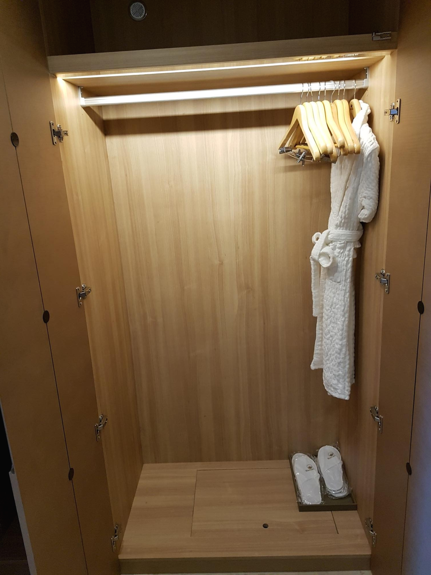넓직한 옷장에는 실내화와 목욕 가운이 걸려 있었어요.