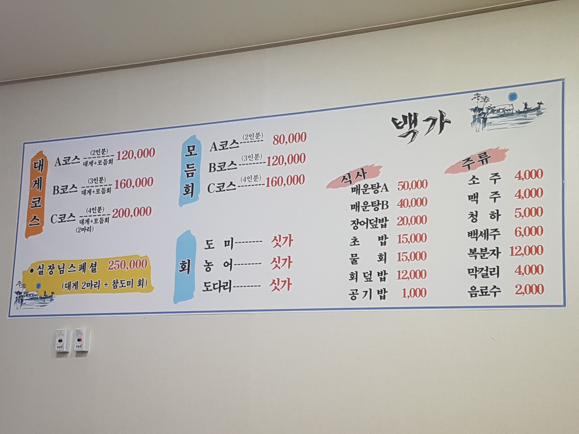 속초를 대표하는 대포항길에 위치한 백가횟집의 주 메뉴판이에요.