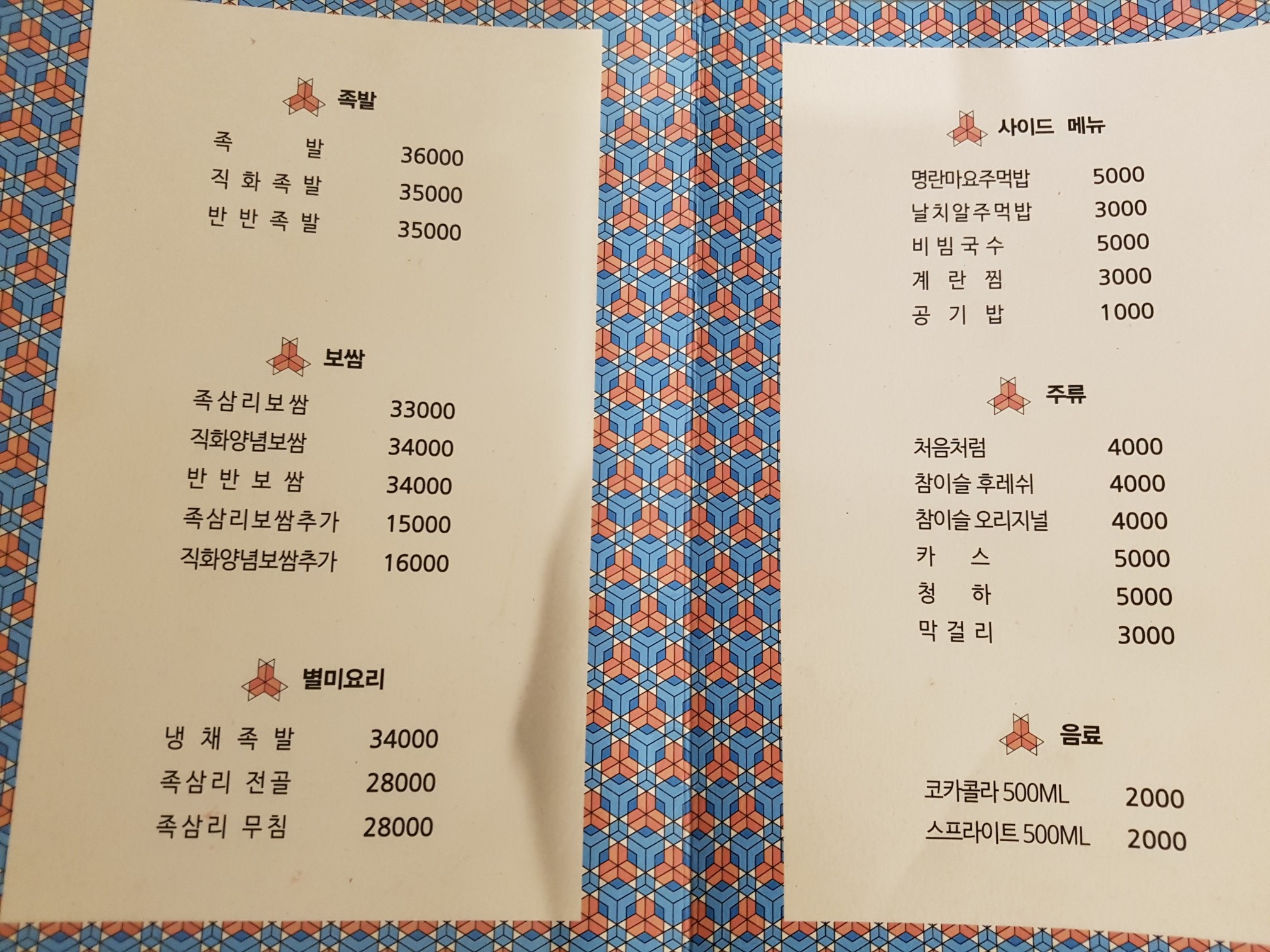 족삼리 홍제점 메뉴판이에요.