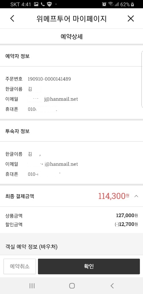 저희는 어른 2, 어린이 2명하고. 어른 2 조식포함해서 위 가격에 객실을 예약했고요. 위매프 10% 쿠폰이 있어서 114,300원에 하루 묵을 수 있었답니다.