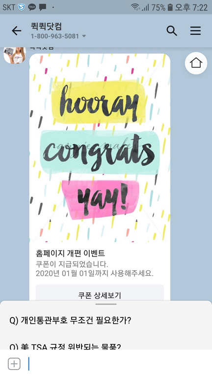 더불어 카카오톡 퀵퀵닷컴채널을 추가하시면 이렇게 쿠폰이 발급되니 배송대행비가 할인되는 특전을 누릴 수 있답니다.^^