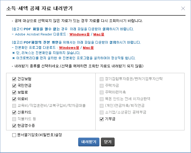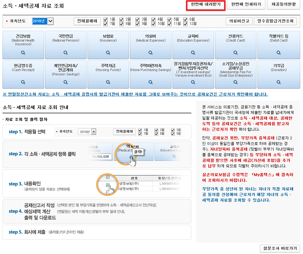 건강보험, 국민연금, 보험료, 의료비, 교육비 등 내려받기 위해서 모두 조회를 해 보셔야 합니다.