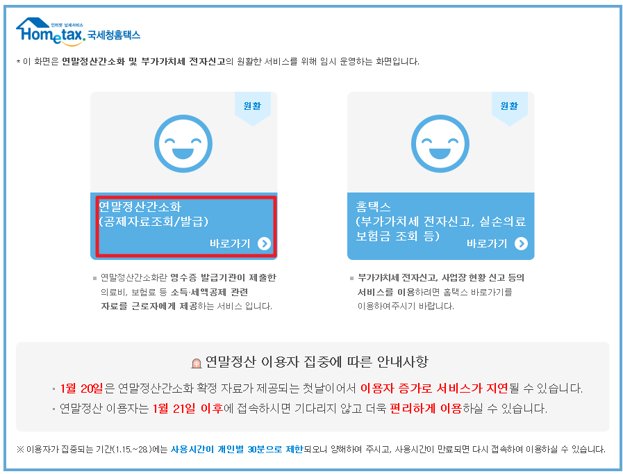 이용자 집중에 따른 서비스 지연에 대한 안내문이 떠 있는데요. 1월 20일은 월요일이고 연말정산간소화 확정 자료가 제공되는 날이어서 더더욱 접속하시면 안될 것 같습니다.ㅠㅠ