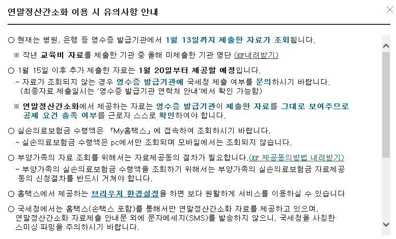 연말정산간소화 서비스 이용시 주의사항 안내입니다.