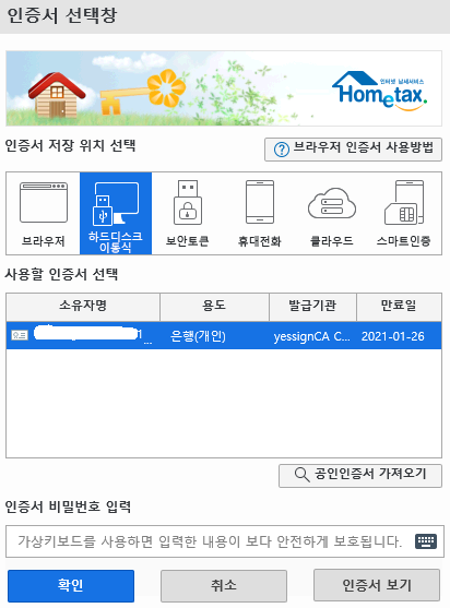 사용할 인증서 선택을 하고 인증서 비밀번호 입력을 합니다.