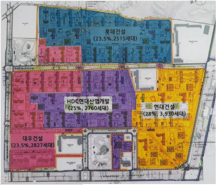 건설사는 4개블럭으로 나뉘어 현대건설(주), HDC현대산업개발(주), 롯데건설(주), (주)대우건설 4개 우리나라 대표 건설사가 시공을 진행한답니다.