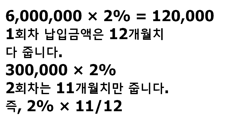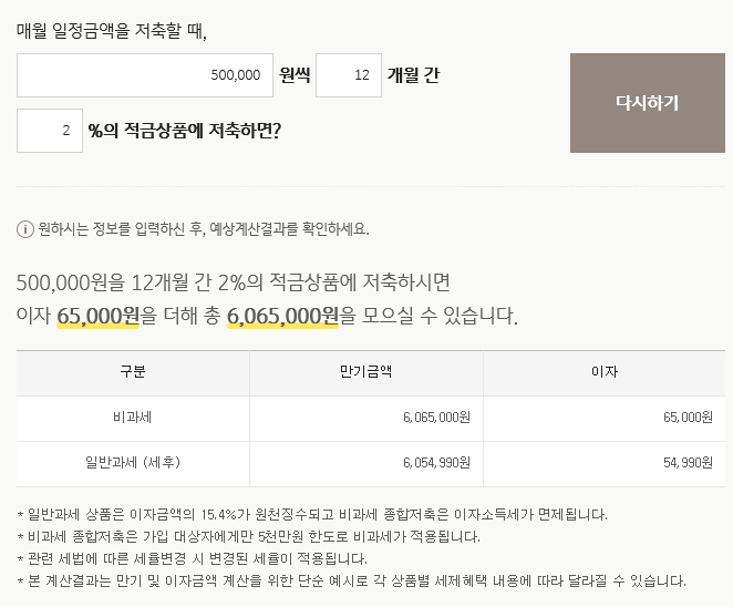 매달 50만원씩을 저축한다고 하면 보통 단리 이자로 2%를 적용하면 일반과세 15.4%를 차감하고 세후 6,054,990원을 1년 후에 받을 수 있답니다.