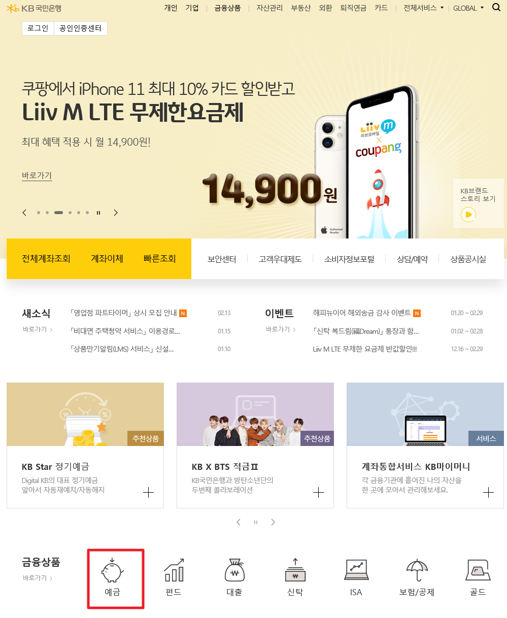 하단에 금융상품 예금을 클릭합니다.