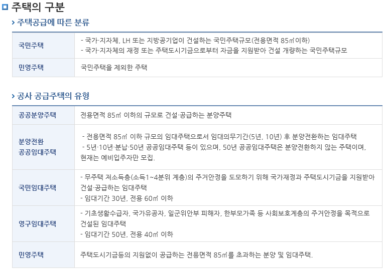 lh공사 공급주택의 유형에 따라서 공공분양주택, 분양전환 공공임대주택, 국민임대주택, 영구임대주택, 민영주택 등으로 구분하고 있습니다.