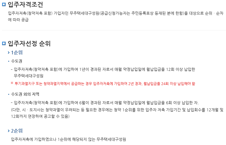 해당 주택건설지역에 거주하는 무주택세대구성원에게 1세대 1주택 공급을 원칙으로 하고 있습니다. 입주자저축(청약저축 포함) 가입자에게 우선 공급하는 것을 1순위로 하고 있죠.
