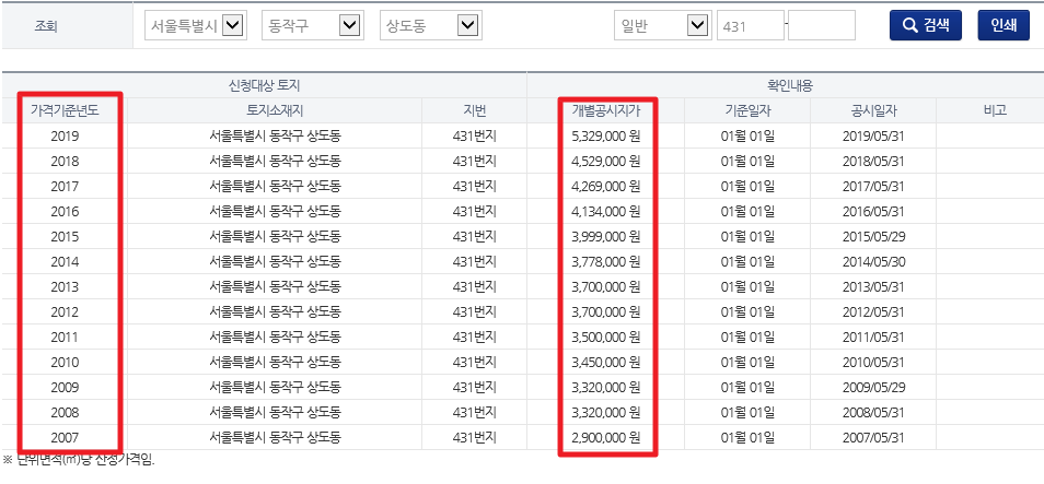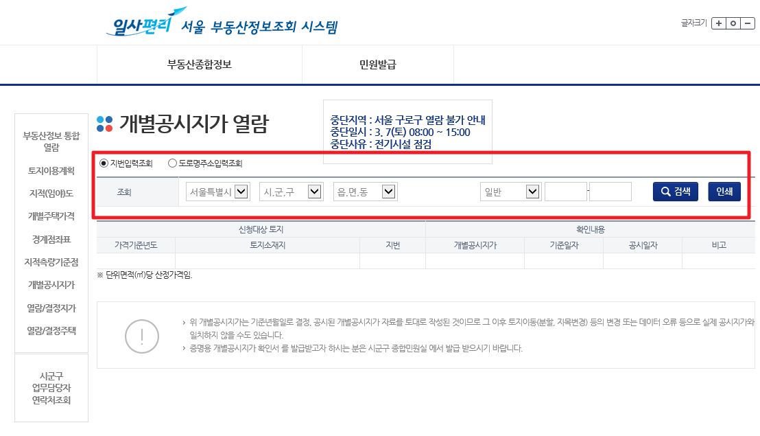지번입력조회를 통해서 개별공시지가를 가격기준년도와 함께 조회가 가능하답니다.