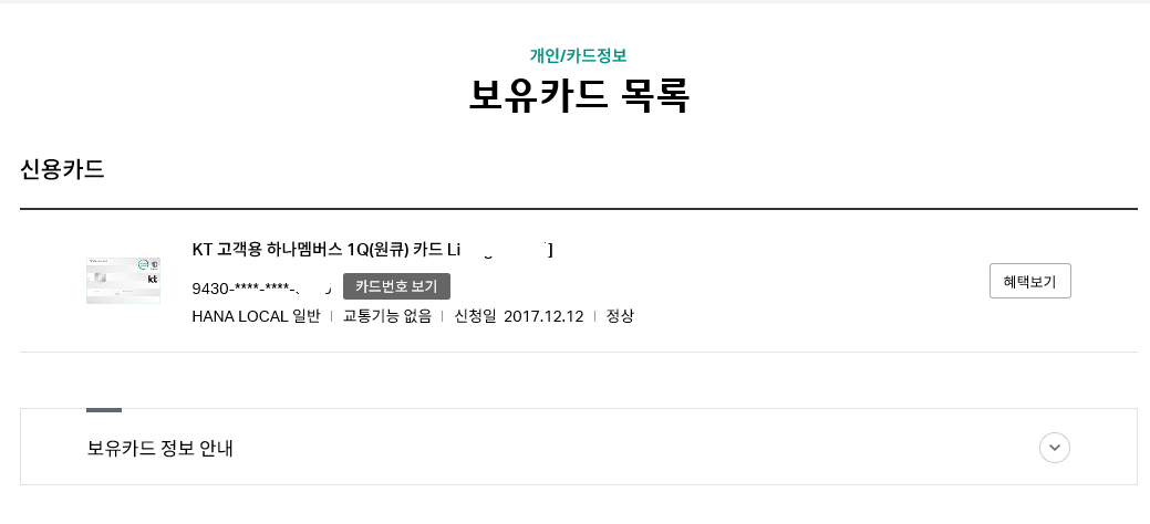 보유카드정보에서 이렇게 KT 고객용 하나멤버스 1Q(원큐) 카드 리빙이 있는 것을 알 수 있고요.