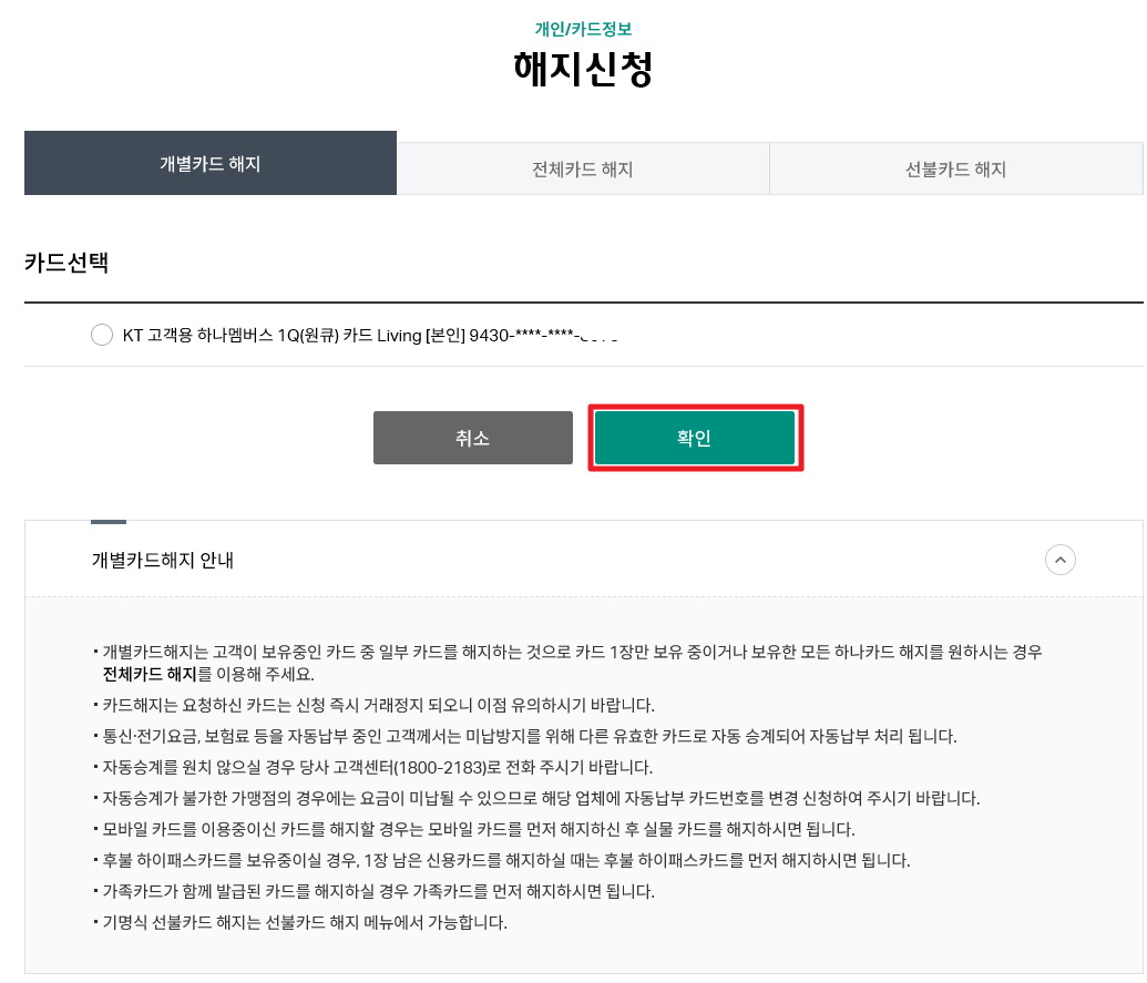 유의사항을 보니 개별카드해지는 고객이 보유중인 카드 중 일부카드를 해지하는 것으로, 카드 1장만 보유 중이거나 보유한 모든 하나카드해지를 원하는 경우에는 전체카드해지를 이용해야 한다고 나와있네요.