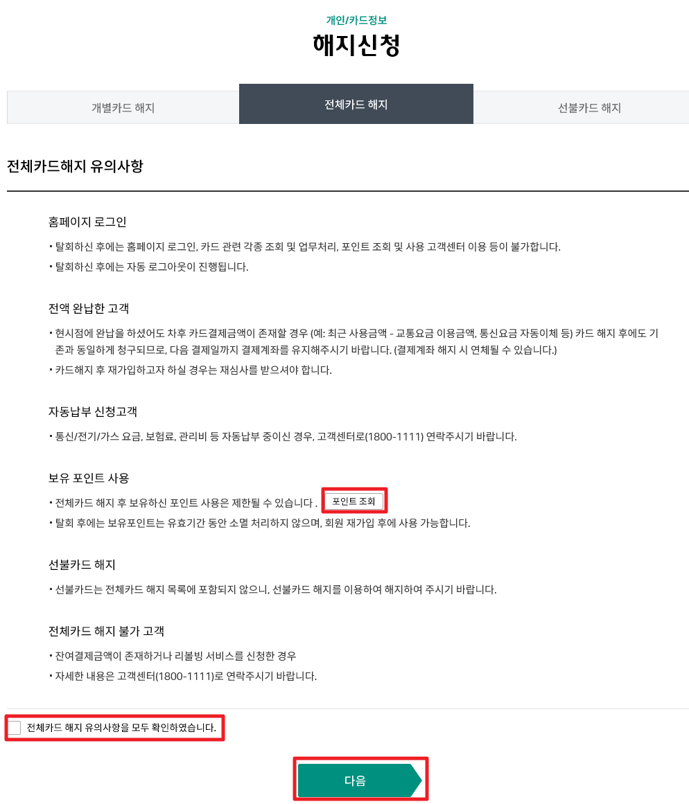 전체카드를 해지할 경우 홈페이지 로그인, 카드 관련 각종 조회 및 보유 포인트 조회 및 사용이 불가 하니, 꼭 포인트 조회를 통해서 포인트는 꼭 사용하셔야겠죠.^^