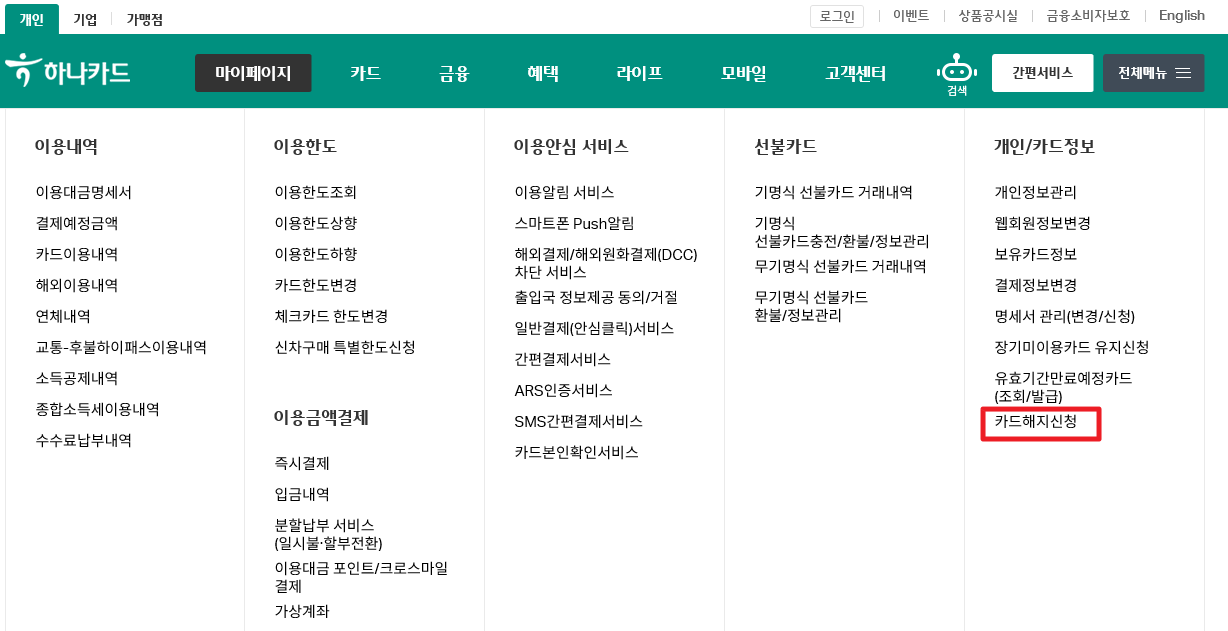 이렇게 개별카드해지 나 전체카드해지를 통해서 하나카드 카드해지신청을 할 수 있어요.