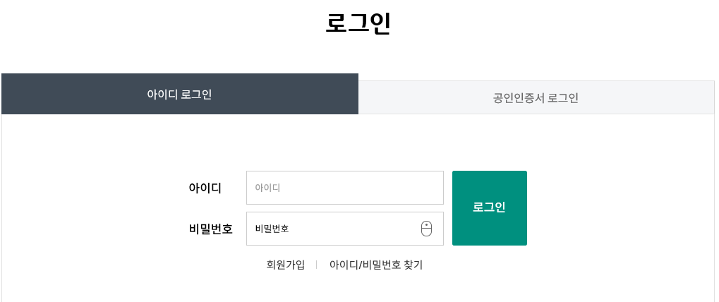 아이디 로그인이나 공인인증서로그인을 통해서 로그인하시고요.