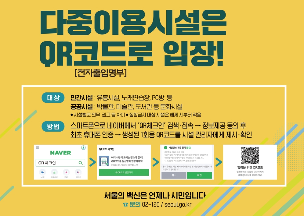 이용자는 QR발급회사(NAVER, 각 통신사 PASS앱 등)로부터 앱으로 QR코드 발급 → 발급받은 개인별 QR코드를 시설관리자에게 휴대폰으로 제시해야 하고요.