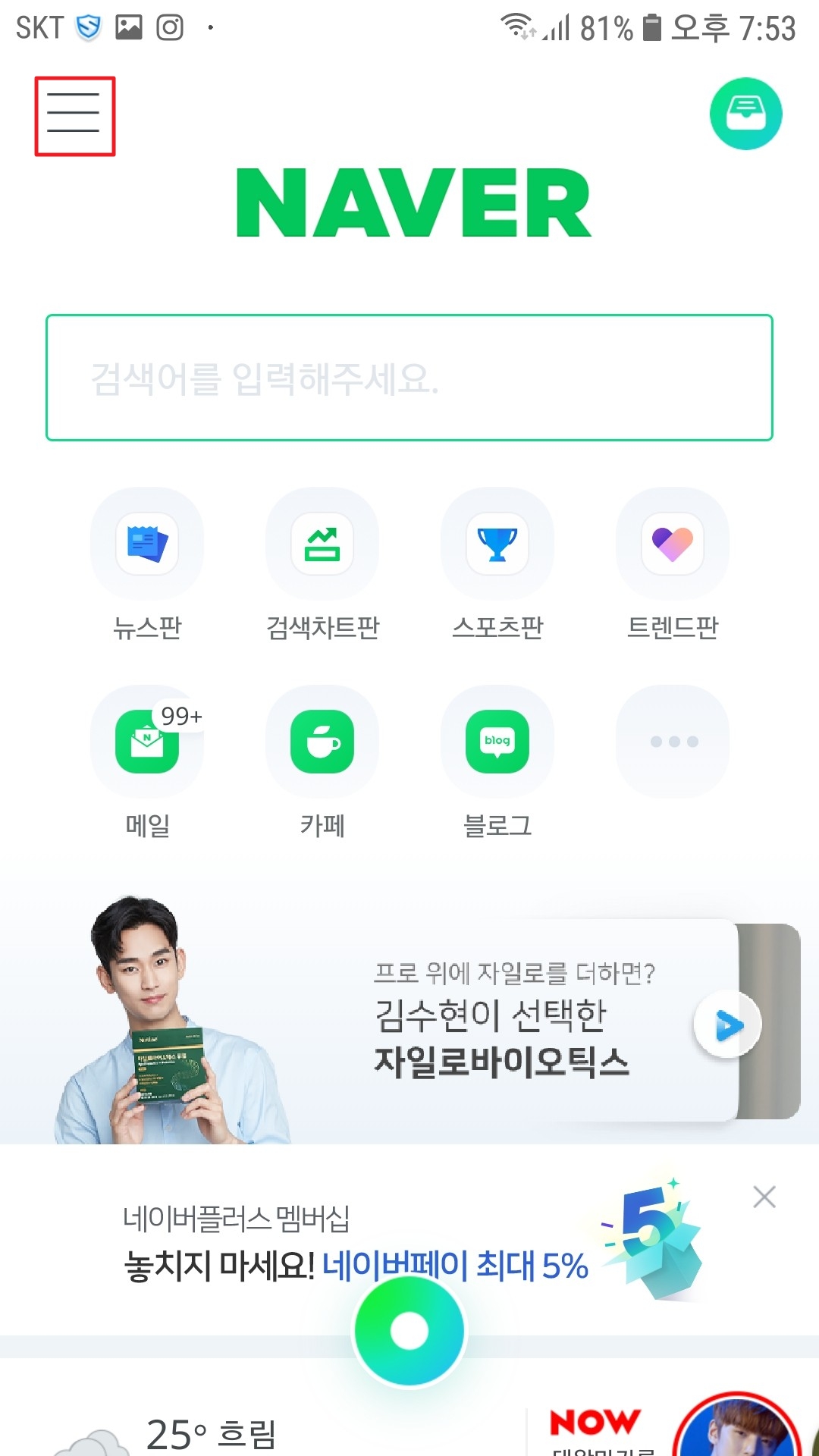 자신의 휴대폰에서 인터넷이나 네이버앱으로 접속합니다.