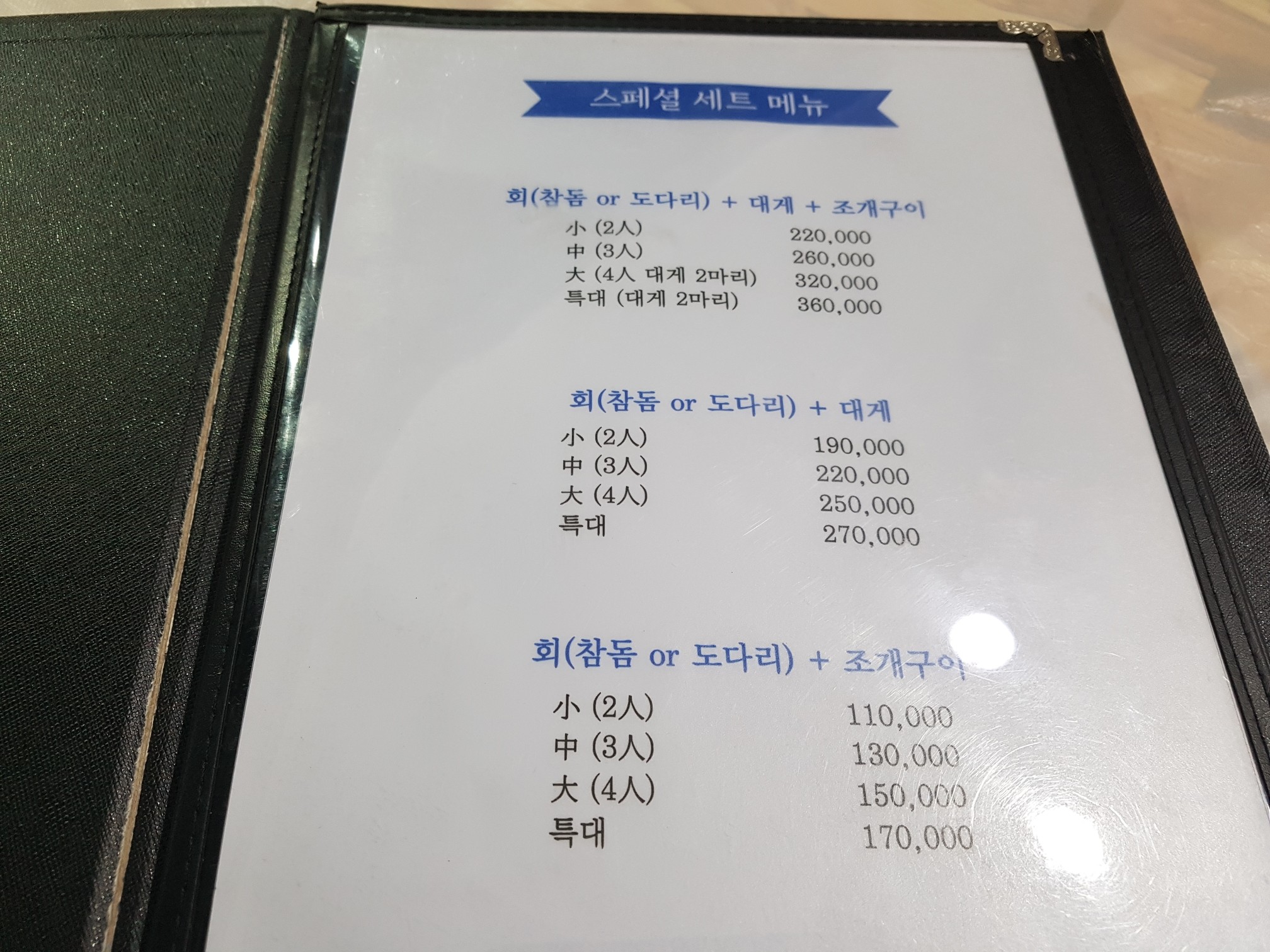 저희는 세트메뉴를 시켰는데요. 대게 플러스 조개구이 '소'자 2인세트로 가격은 15만원이에요.