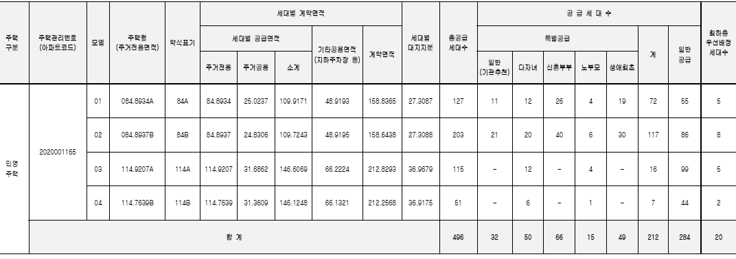 주택형별 공급세대수는 위와 같습니다. 전용면적별 세대 수는 △84㎡A 127세대 △84㎡B 203세대 △114㎡A 115세대 △114㎡B 51세대.