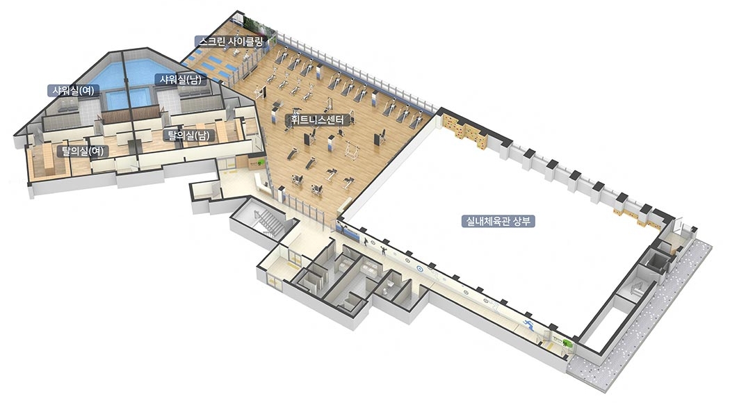 2. 자전거를 타며 체력을 키울 수 있는 '스크린 사이클링'과 최근 주목받는 레저스포츠 중 하나인 '실내 암벽등반', 미세먼지와 날씨에 상관없이 이용할 수 있는 '체육관' 등을 조성할 예정입니다.