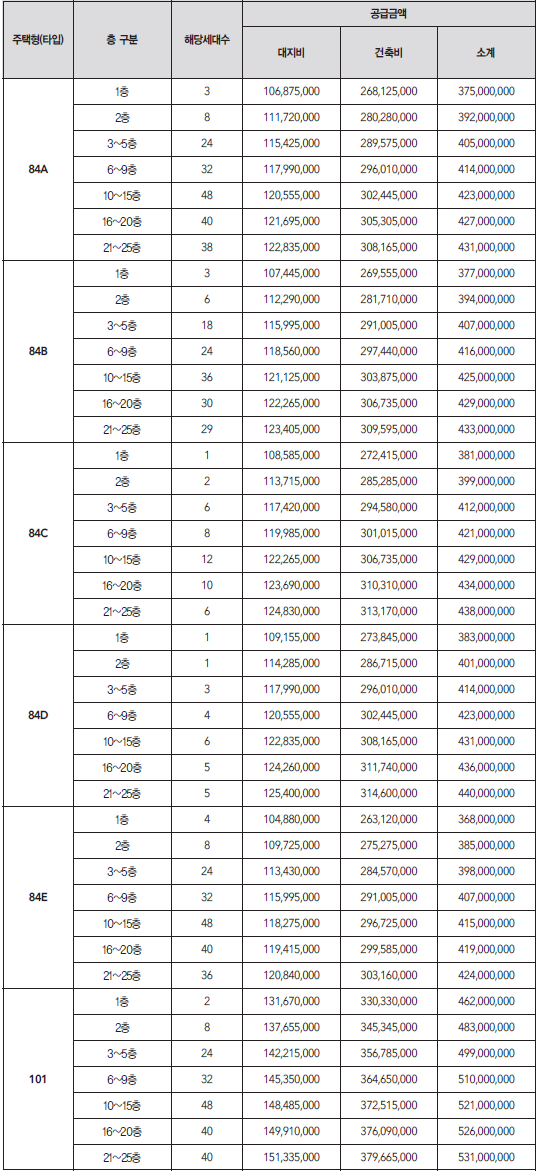 분양 가격은 84㎡가 주택형 및 층수에 따라 3억6800만~4억4000만원으로 책정됐으며, 101㎡는 4억6200만~5억3100만원으로 책정됐답니다.