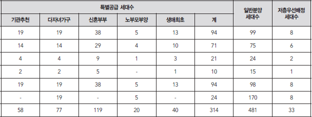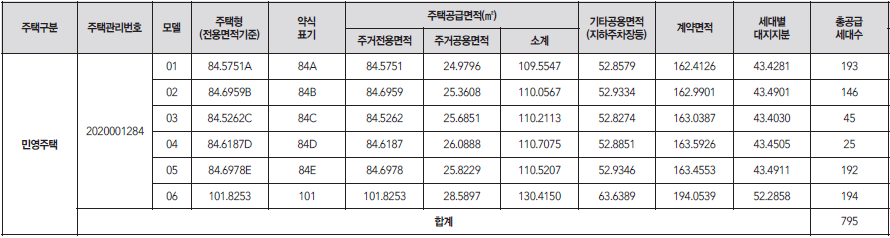 전용면적·주택형별 가구 수는 △84㎡A 193가구 △84㎡B 146가구 △84㎡C 45가구 △84㎡D 25가구 △84㎡E 192가구 △101㎡ 194가구로 구성돼 있습니다.