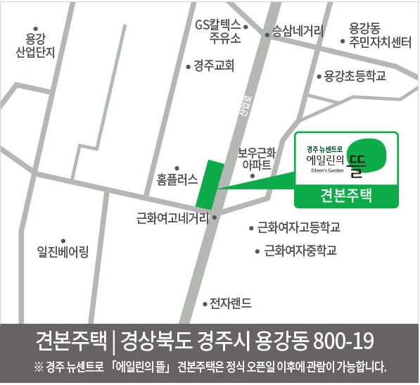- 뉴센트로에일린의뜰 모델하우스는 경주시 용강동 800-19번지에 위치해 있고요.