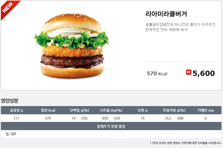 리아미라클버거의 영양성분을 살펴보면요.