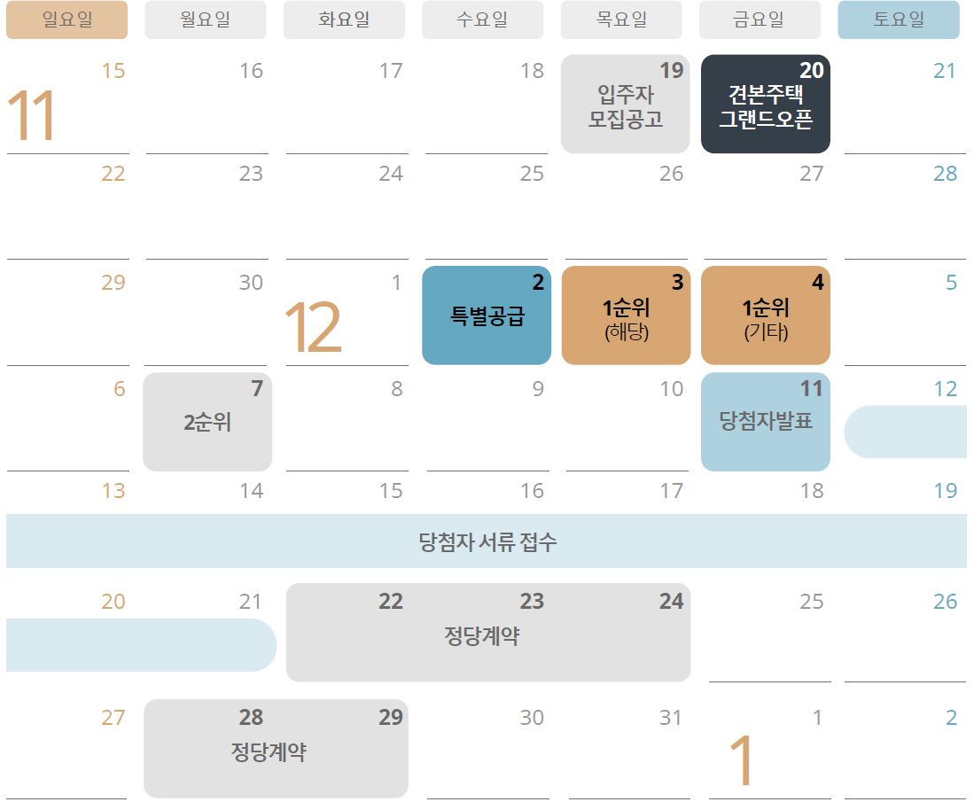 12월 2일 특별공급 △3일 1순위 해당지역 청약 △4일 1순위 기타지역 청약 △11일 당첨자 발표 △22~24일·28~29일 정당계약 순으로 일정이 진행됩니다.