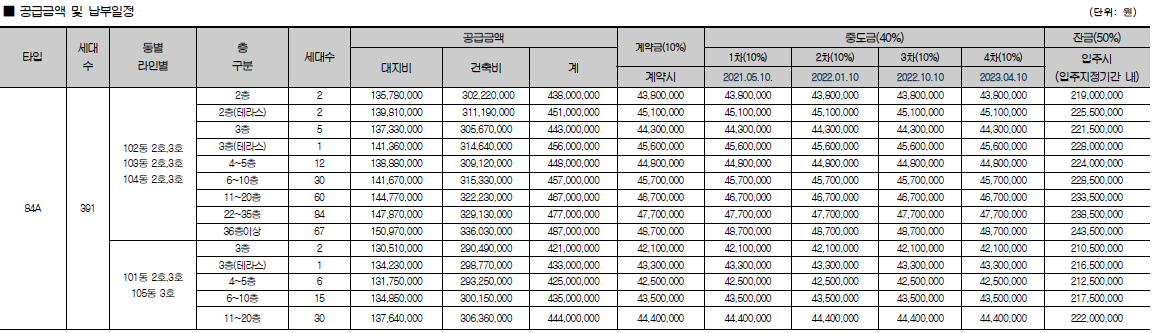 분양금은 계약금 10%, 중도금 40%, 잔금 50%로 구성됩니다.