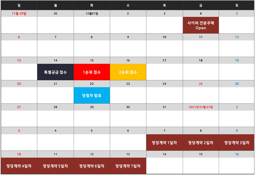 당첨자 발표일은 22일(화)이며, 정당계약은 21년 1월 7일(목)부터 13일(수)까지 7일 간 진행됩니다.