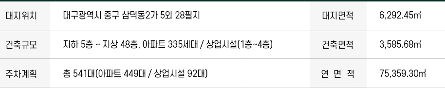 단지는 지하 5층~지상 최고 48층, 2개 동, 전용면적 84㎡인 335가구로 이뤄진 아파트와 단지내 상업시설 ‘동성로SK리더스뷰애비뉴’는 지상 1~4층에 들어서며, 규모는 연면적 약 1만6076㎡(약 4863평), 총 179실로 구성된 주상복합이랍니다.
