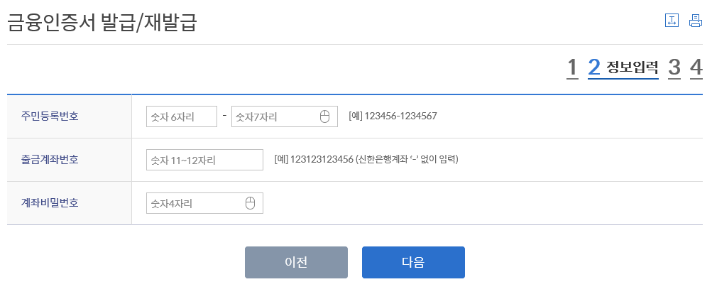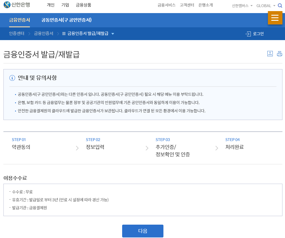 신한은행 금융인증서 발급을 받으려면 기존의 공인인증서 발급처럼 하시면 되는데요.