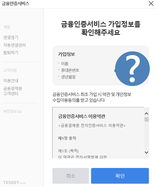 금융인증서비스 가입정보를 확인하고, 이용약관에 동의하는 절차입니다.