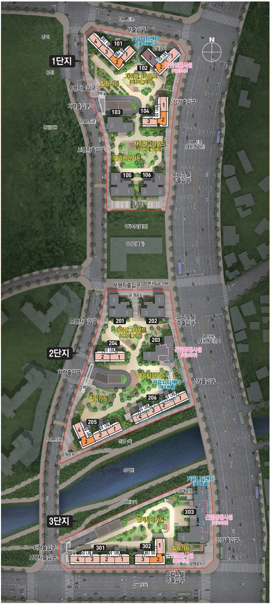 판교밸리자이는 단지가 3블럭으로 나눠져 있는데, 단지 레벨차를 이용한 스트리트형 상가와 연계된 단지 계획을 멋지게 구성했답니다.