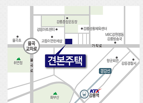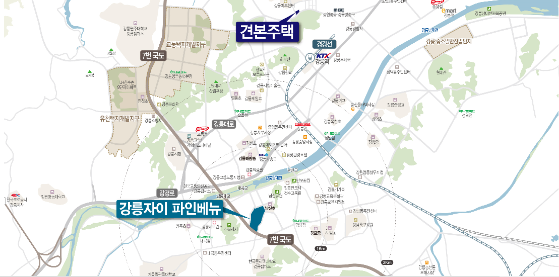 단지에서 약 2km 거리에 KTX 강릉역이 위치해 있어 서울까지 약 1시간 40분이면 이동이 가능하답니다.