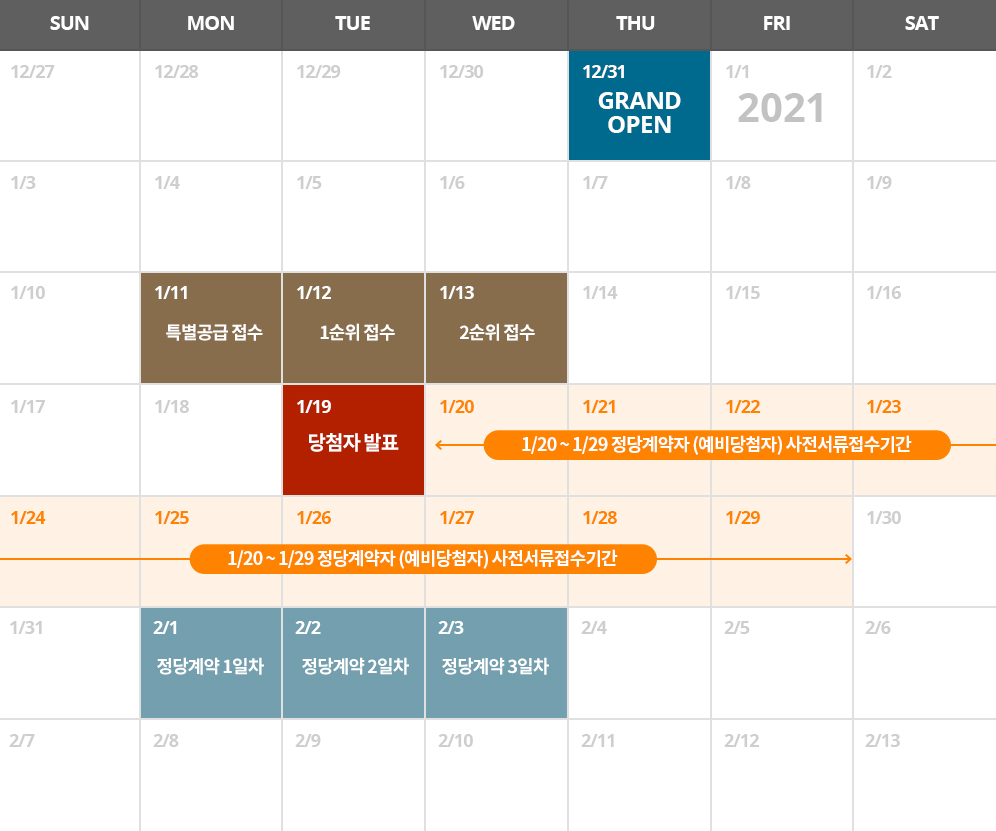 1월 11일 특별공급을 시작으로 1월 12일 1순위, 1월 13일 2순위 청약 접수를 받습니다.