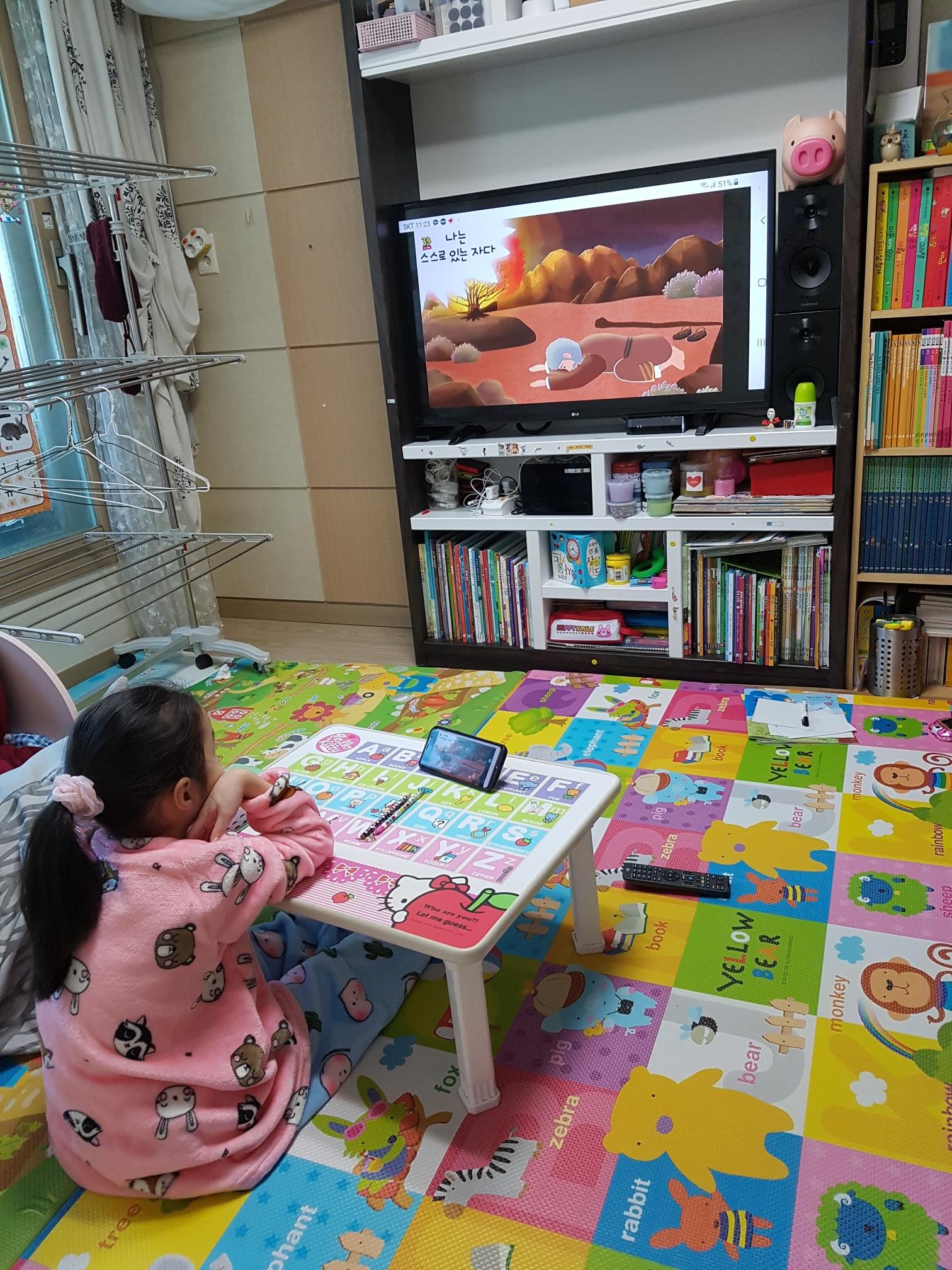 오늘은 둘째 딸래미가 교회에 못 나가고 온라인예배를 받게 됐는데요. 휴대폰 화면이 작아서 궁리를 한 결과, 스마트폰 미라캐스트를 통해 대형tv와 연결하는 방법이 있더라고요.
