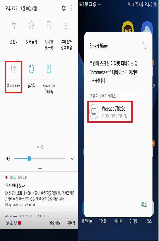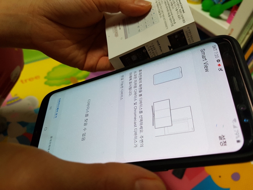 초기화면이 나오면 스마트폰에서 Smart View(스마트뷰) 설정으로 들어가서 설정을 해 주시면 연결이 됩니다.
