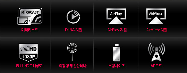 미라케스트, DLNA지원, AirPlay/AirMirror 지원, full HD 고해상도, 외장형 무선안테나, 무선 브릿지, 다기능 무선 디스플레이어입니다.