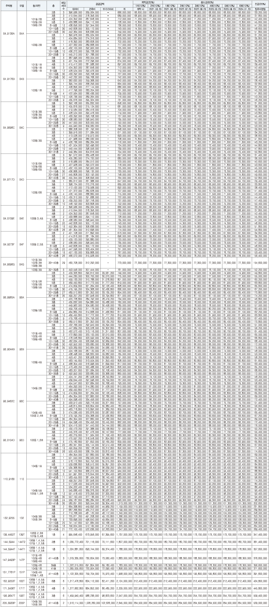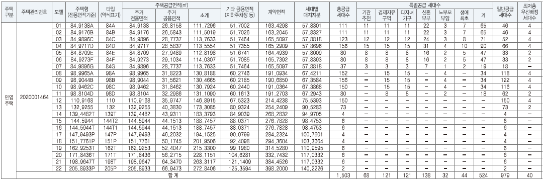 전용면적 별로는 ▲84㎡ 698가구 ▲98㎡ 538가구▲110㎡ 150가구▲132㎡ 73가구▲139~198㎡T (테라스하우스) 34가구▲147~205㎡P (펜트하우스) 10가구로 구성된다.