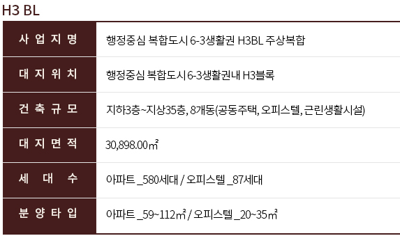 H3블록은 지하3층, 최고 지상35층, 8개동, 전용면적 59~112㎡ 아파트 580세대, 전용면적 20~35㎡ 오피스텔 87실로 구성된답니다.