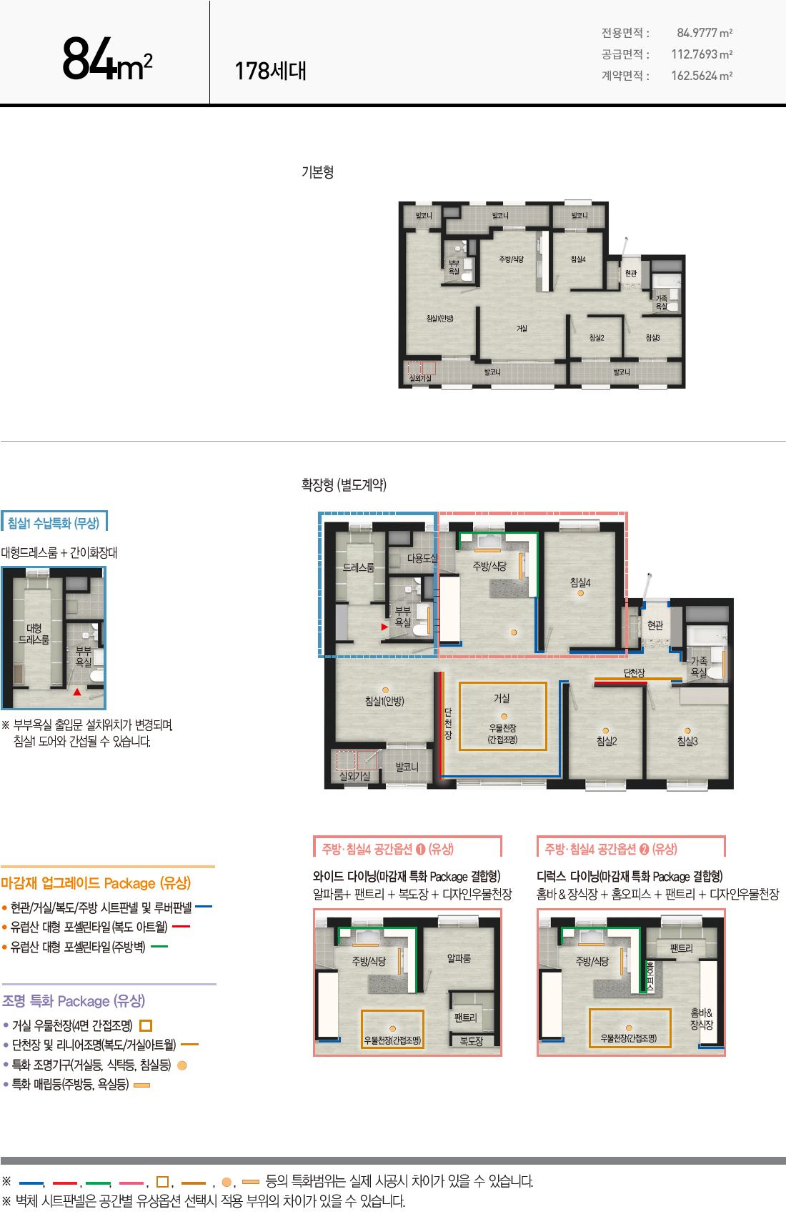 수납공간 특화 대형 드레스룸(일부 타입 제외)도 무상으로 제공된다. 분양가구수가 가장 많은 전용면적 84㎡의 경우 기본 침실 4곳이 제공된다.