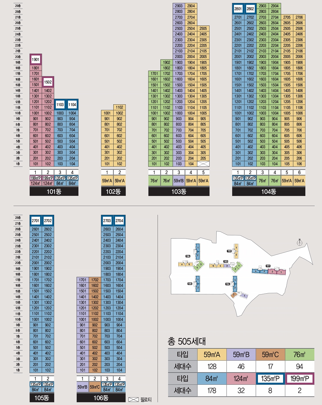단지는 지하 3층 지상 최고 29층 6개동 전용면적 59~199㎡ 505가구로 구성되고요.
